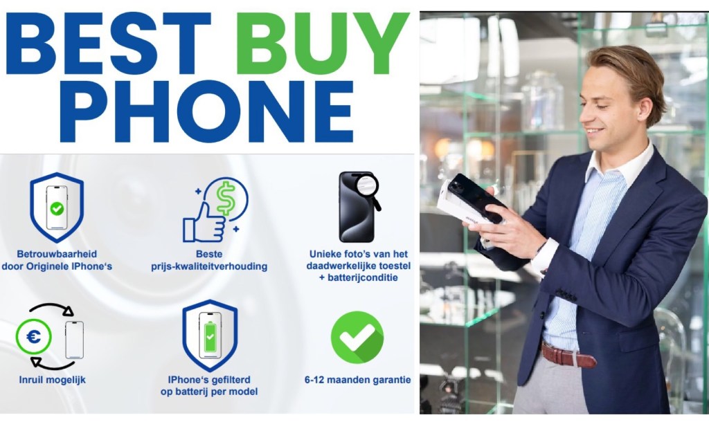 Ik zou zeggen neem eens een kijkje op de website en laat je adviseren door Twan. Bespreek samen de mogelijkheden en kies daarin wat voor jou het beste past. Ook biedt Best Buy Phone een iPhone inruilmogelijkheid, doe daar je voordeel mee. Verder kun je kiezen voor de optie afhalen of laten verzenden. Ik kan je verzekeren, het is absoluut de moeite waard. Je krijgt voor een zeer nette prijs, een origineel en duurzaam product inclusief 6-12 maanden garantie.